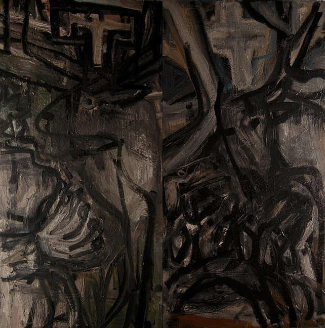 | Jacek Olczyk : ta peinture est sombre... au premier coup d'œil les paysages, les animaux sont à peine visibles. Qu'implique une telle lecture de la réalité qui t'entoure ? Laurent Savoie : je travaille dur à ma peau et mémoire d'éléphant... si ma peinture figure, c'est un mur... elle est nourrie des classiques en peinture et littérature. Jacek Olczyk : Le noir est une appréciation de la réalité, une métaphore ? Laurent Savoie : le noir s'applique seulement à ma peinture, ce n'est pas l'appréciation d'une réalité. C'est un noir envahissant, qui génère des surfaces dynamiques. |